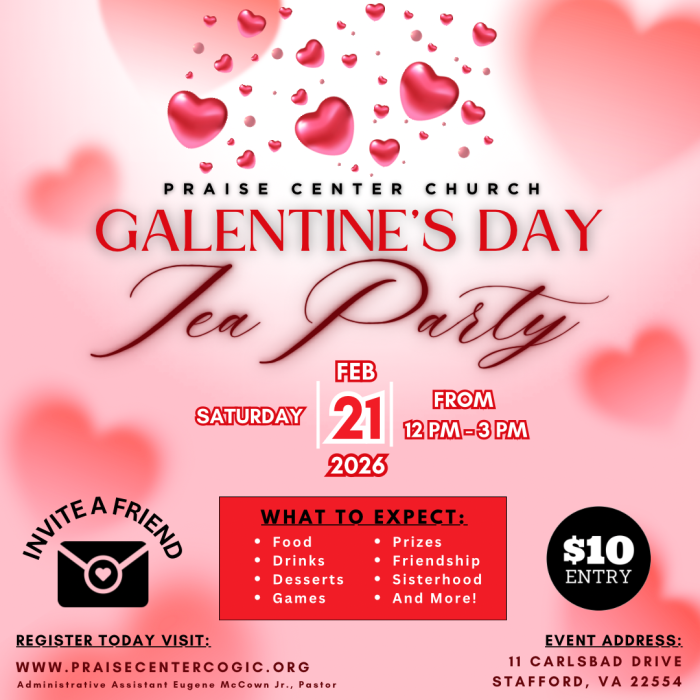 We would like to Formally Invite you to the 2nd Annual Youth Galentines Day Tea Party Hosted by Administrative Assistant Eugene C. McCown Jr, Pastor of Praise Center COGIC. Join…