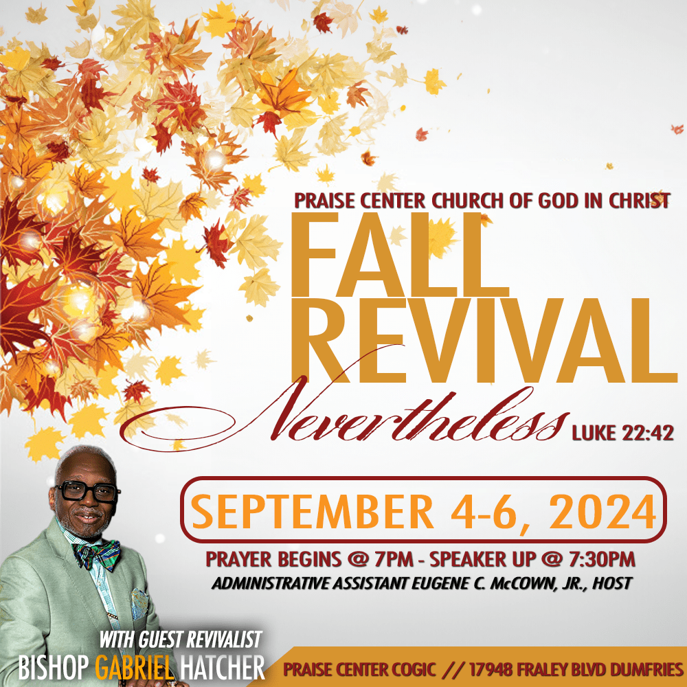 DetailsDumfries, Virginia — Praise Center invites you join us on September 4-6, 2024 for a three night, power-packed revival starting at 7:00 pm nightly. Our theme for 2024 is The…