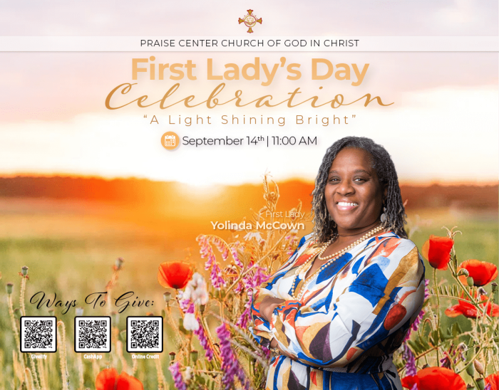 Praise Center Church warmly invites you to celebrate Lady Yolinda McCown during our Annual First Lady Day Celebration on Sunday, September 15, 2024, at 11:00 am and 4:00 pm. We…
